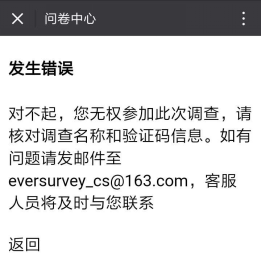注意:若输入验证码后提示发生错误,“无权参加调查”(如下图),请确认验证码输入是否正确。若还是提示此错误,请联系你的指导老师或按提示直接发送“学校名称”、“姓名”、“学号”及“专业”信息至eversurvey_cs@163.com邮箱。