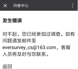 注意:若输入验证码后提示“重复参加调查”错误(如下图),请确认是否已经答题,系统提示重复答题,表明问卷已存入数据库,你无需再次答题。