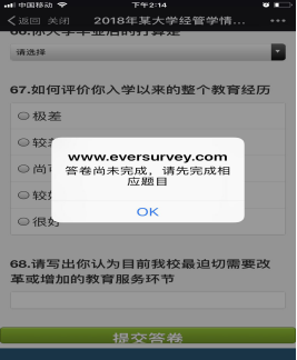 完成所有必答题目后,点击“提交问卷”。如有漏答,提交答卷后系统提醒“请完成相应题目”。