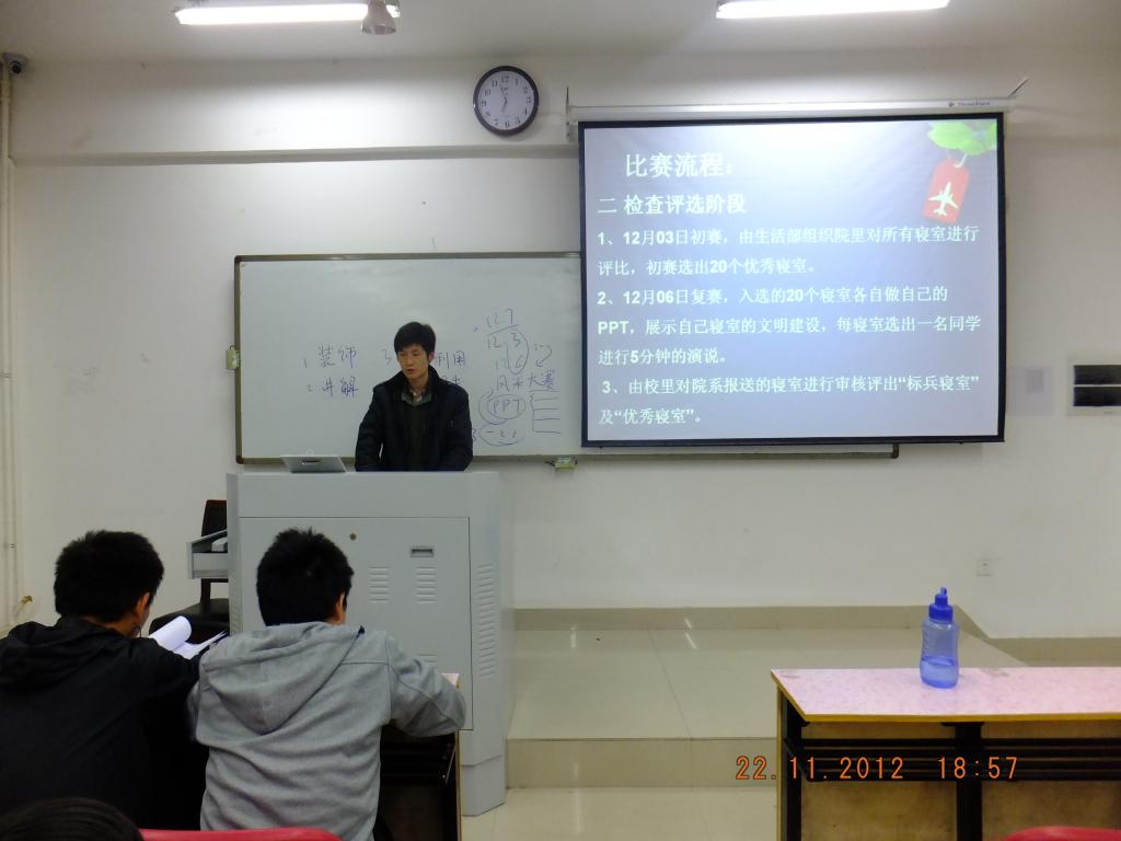 2012年11月22日晚上6点30分,由经济学院组织的经济学院文明宿舍创建动员活动在教2-209隆重举行,12级各班班主任及全体大一新生共同参加了此次活动。