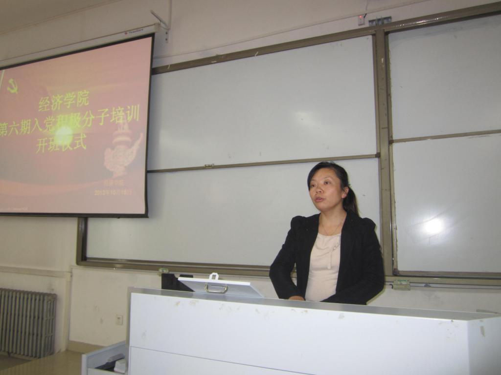2013年10月15日中午12点30,经济学院在教二116隆重举行了第六期党课开班仪式;参加仪式的人员有:经济学院党委书记孙向东、党委副书记杨睿、辅导员孙璐、张静老师及各班推选出来参加党课培训的同学。