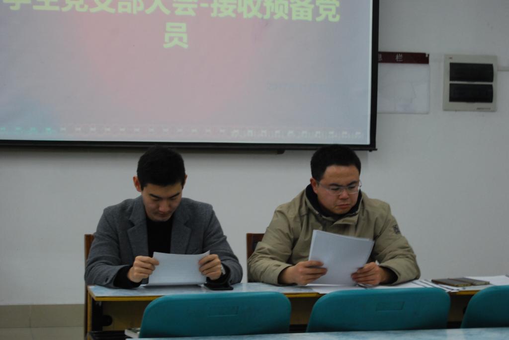 大会伊始,张荣埔宣布经济学院第一党支部与第二党支部合并,并介绍了合并后的人事安排。随后,刘洋宣读预备党员发展对象名单,12名发展对象依次上台介绍自身情况提出入党申请,预备党员宣读转正申请书,经正式党员投票且全票通过后,12名发展对象全部转为预备党员,预备党员转为正式党员。大会最后,张荣埔对全体预备党员宣讲党员要求,提出加入党组织要注重自身一言一行,不仅做到在形式上,还要在思想上、行动上都完全符合党员的标准。